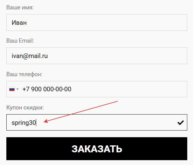Чтобы получить скидку на любой видеосеминар, введите промокод в соответствующее поле при заказе, как показано на рисунке ниже: